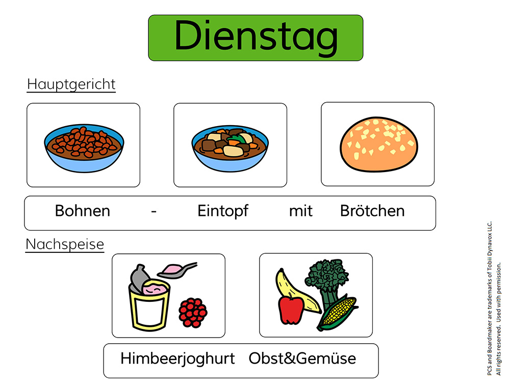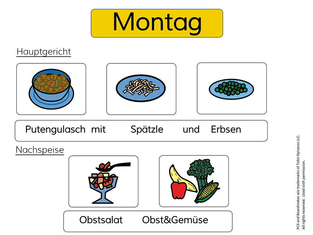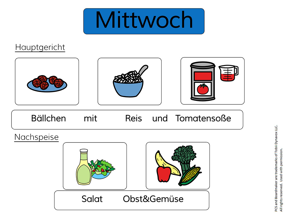 Essenspläne Montag Dienstag Mittwoch Montag – 06.10.2025 Dienstag – 07.10.2025 Mittwoch – 08.10.2025 PCS and Boardmaker are trademarks of Tobii Dynavox LLC. All rights reserved. Used with permission. Hier geht es zur Homepage der Wolfsburger Schulverpflegungs GmbH.